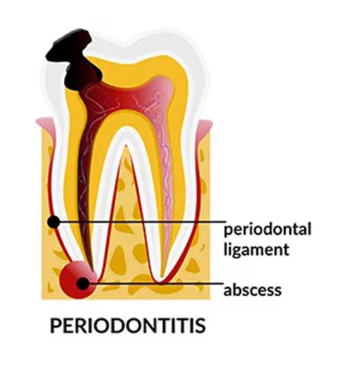 Końcowa część korzenia, najwęższa i najbardziej oddalona od korony, to wierzchołek korzenia, przez który do kanału korzeniowego wnikają naczynia i nerwy. Następnie od wierzchołka przez całą długość korzenia biegną one do komory, gdzie tworzą miazgę zębową, która stanowi żywą strukturę zęba. Stany zapalne miazgi zęba, jako efekt próchnicy twardych tkanek, przenikają do okolicy i tkanek okołowierzchołkowych poprzez kanały zębowe. Przewlekły i bezobjawowy proces zapalny miazgi może być przyczyną chorób tkanek okołowierzchołkowych zęba. Choroby tych tkanek mogą mieć charakter niewielkich ziarniniaków, ale również rozległych torbieli zapalnych.