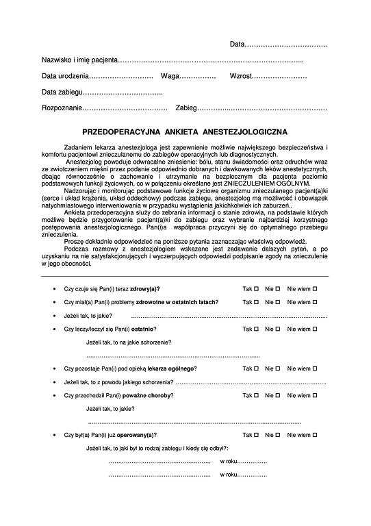 Szczegółowych informacji udziela pacjent, wypełniając specjalnie przygotowaną i zalecaną do pobrania. Jej ostateczne wypełnienie powinno się odbyć w obecności lekarza anestezjologa. Dokładne przeczytanie ze zrozumieniem i złożenie podpisu przez pacjenta lub jego opiekuna prawnego pod prawidłowo wypełnioną ankietą jest jednym z niezbędnych warunków umożliwiających przeprowadzenie procedury zabiegowej.