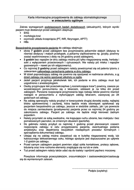 W trakcie dopełniania formalności poprzedzających rozpoczęcie zabiegu pacjent (ewentualnie jego rodzice lub ustawowy opiekun prawny) winien potwierdzić pisemnie, podpisując OŚWIADCZENIE I ZGODĘ NA ZNIECZULENIE, że przekazane mu informacje były dla niego zrozumiałe oraz wyjaśniły wszelkie wątpliwości z wcześniejszą nieograniczoną możliwością zadawania pytań i uzyskaniem na nie satysfakcjonujących odpowiedzi.