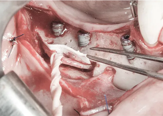 Sterowana regeneracja kości GBR przy użyciu biomateriałów oraz membran zaporowych. Procedury te są stosowane w sytuacji niedostatecznej ilości kości, skutkującej odsłonięciem gwintu, podczas gdy wszczepiamy implanty stomatolo-giczne lub też jako zabiegi poprzedzające ich wprowadzenie.