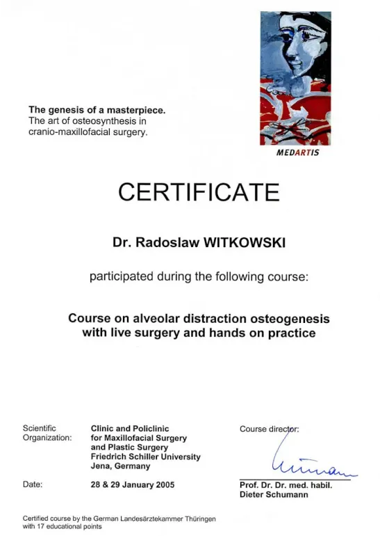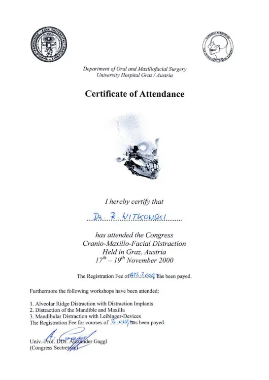 Dr Witkowski brał udział w licznych kursach oraz szkoleniach dotyczących technik osteodystrakcji i stosuje je w praktyce chirurgicznej.